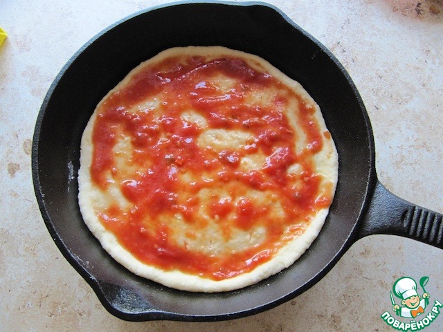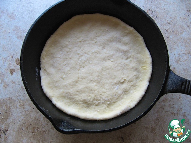 Тесто разделить на 2 части (хватит на 2 порции, диаметр сковородки - 20 см). Дно сковородки подпылить мукой, тесто раскатать, выложить в сковродку.