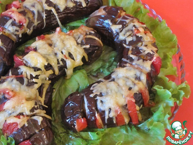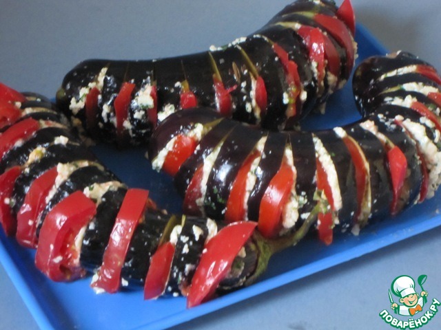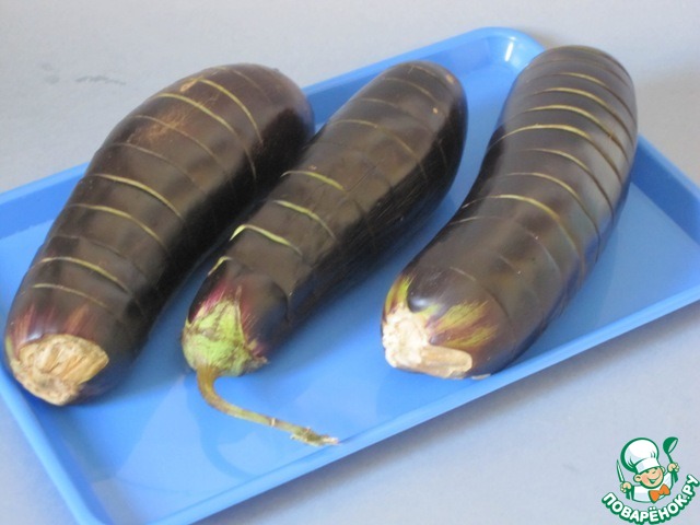 Баклажаны вымыть и порезать поперек на кольца, не дорезая до конца. Должна получиться "гармошка".