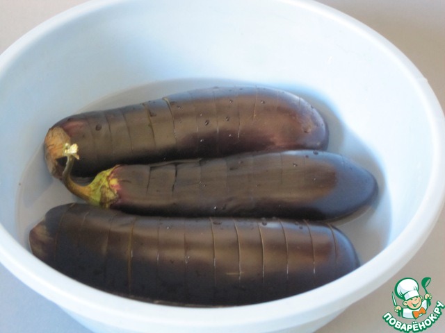 Положить баклажаны в соленую воду на 1,5 часа, чтобы ушла горечь.