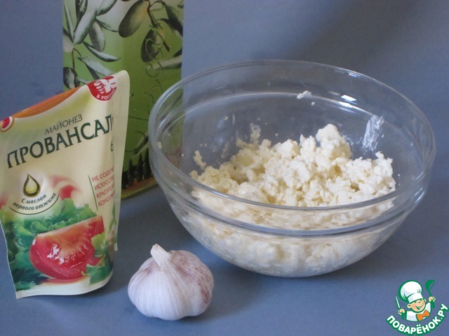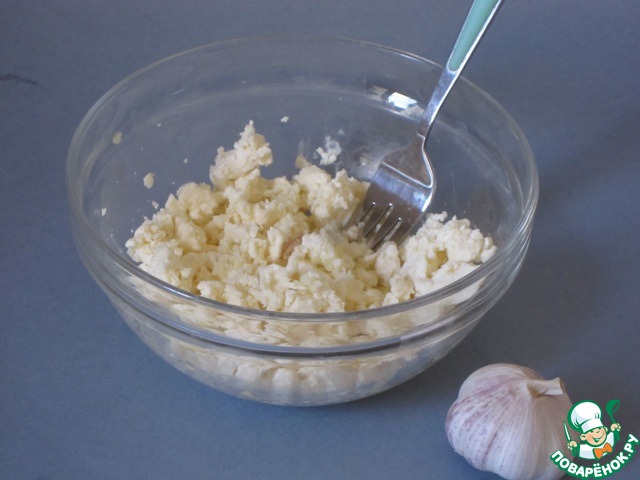 Брынзу размять вилкой, добавить пропущенный через пресс чеснок.