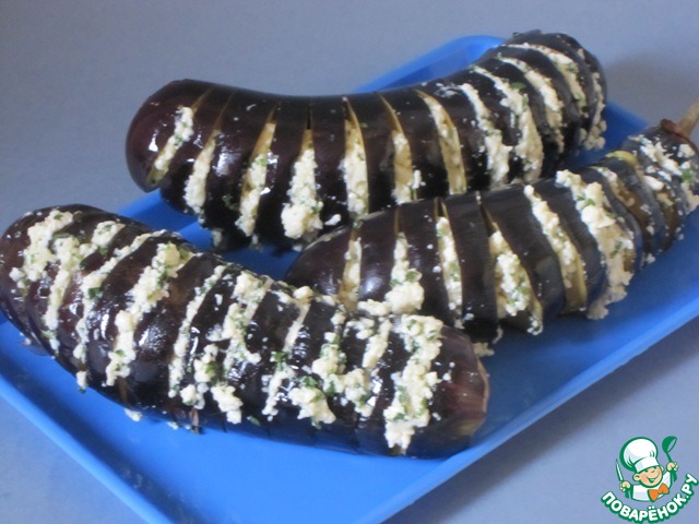Баклажаны внутри разрезов смазать 1 столовой ложкой растительного масла. Заполнить каждый разрез начинкой из брынзы.