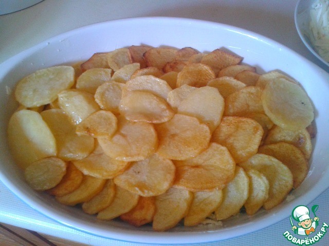 Картофель порезать кружочками и обжарить немного с двух сторон в течение 5мин, немного солим.