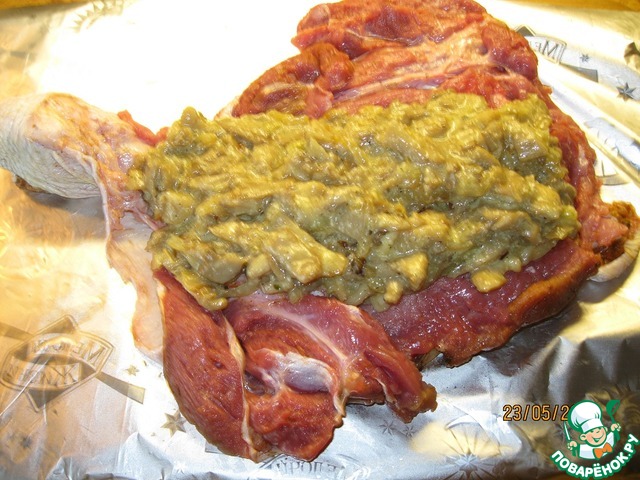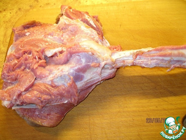 Вообще намеревалась запечь просто целиком, а на следующий день надумала фаршировать. Поэтому, рекомендую обтирать специями уже разделанную ножку. Уложить в 2 пакета или обмотать пищевой пленкой и-в холодильник на 2 ч. Я оставила на сутки.