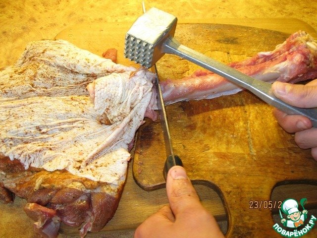 Кость отрубить, удалить из мяса мелкие кости и сухожилия