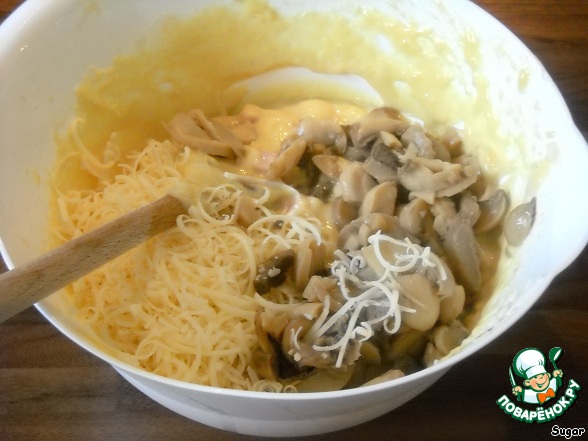 Когда масло хорошо "вошло" в тесто, добавляем сыр и шампиньоны. Еще раз размешиваем, чтобы получилась однородная масса.