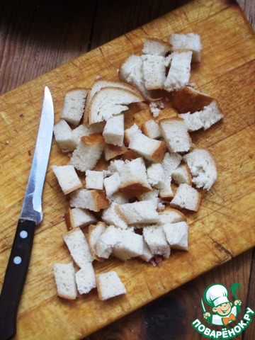 Хлеб нарезаем крупным кубиком. Мне понадобились 4 ломтика багета.