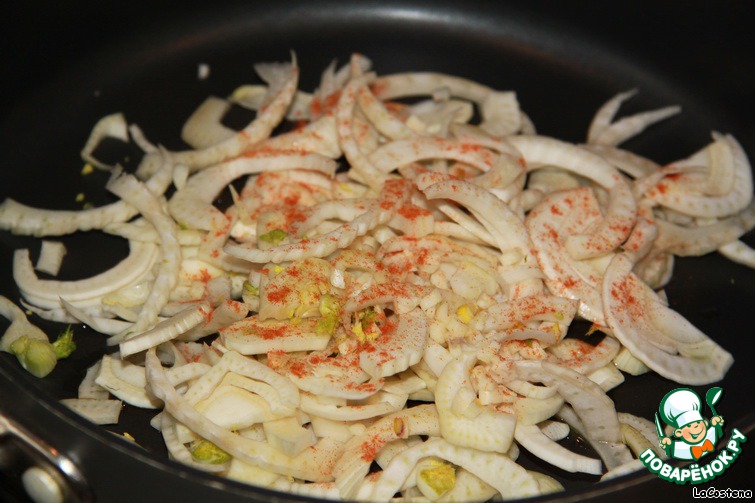 Выложить фенхель, чеснок и молотый перец чили на теплую сковороду с оливковым маслом.