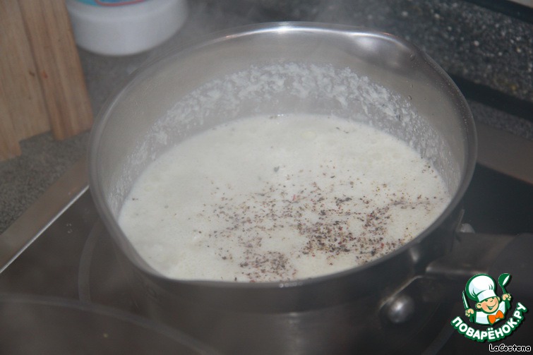Поставим сливки на плиту, нагреем. Добавим сыр и смесь из перцев.