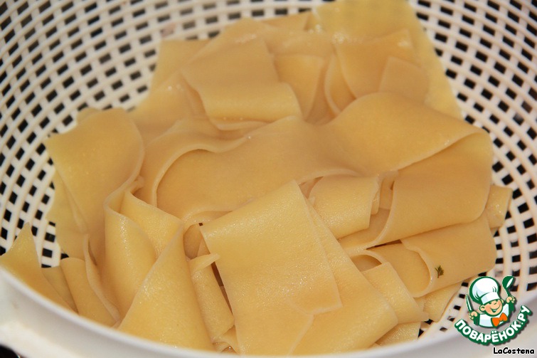 В это время отварить макароны. У меня были паппарделле. Это разновидность пасты, которая отличается своей шириной.