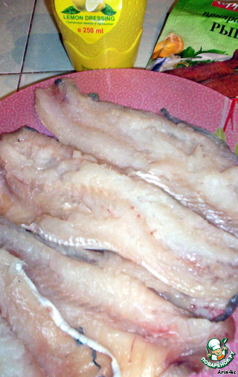 Подойдет любая не костлявая белая рыба. У меня был минтай. Рыбку помыла, удалила внутренности, голову и плавники. Отделила позвоночник. Получившееся филе слегка отбила, посыпала специями и полила лимонным соком. Оставила мариноваться.