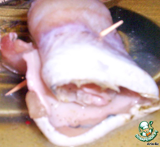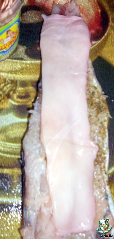 На филе рыбы выкладываем кусочек кальмара, так чтобы он не выступал за края рыбы.