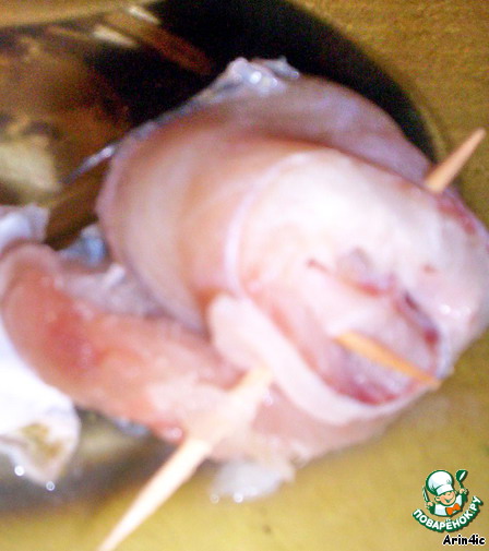 Получившиеся два рулетика протыкают каждый другой зубочисткой перпендикулярно первой зубочистке. Такие процедуры проделываем с каждой рыбкой. Процесс не быстрый, но увлекательный!