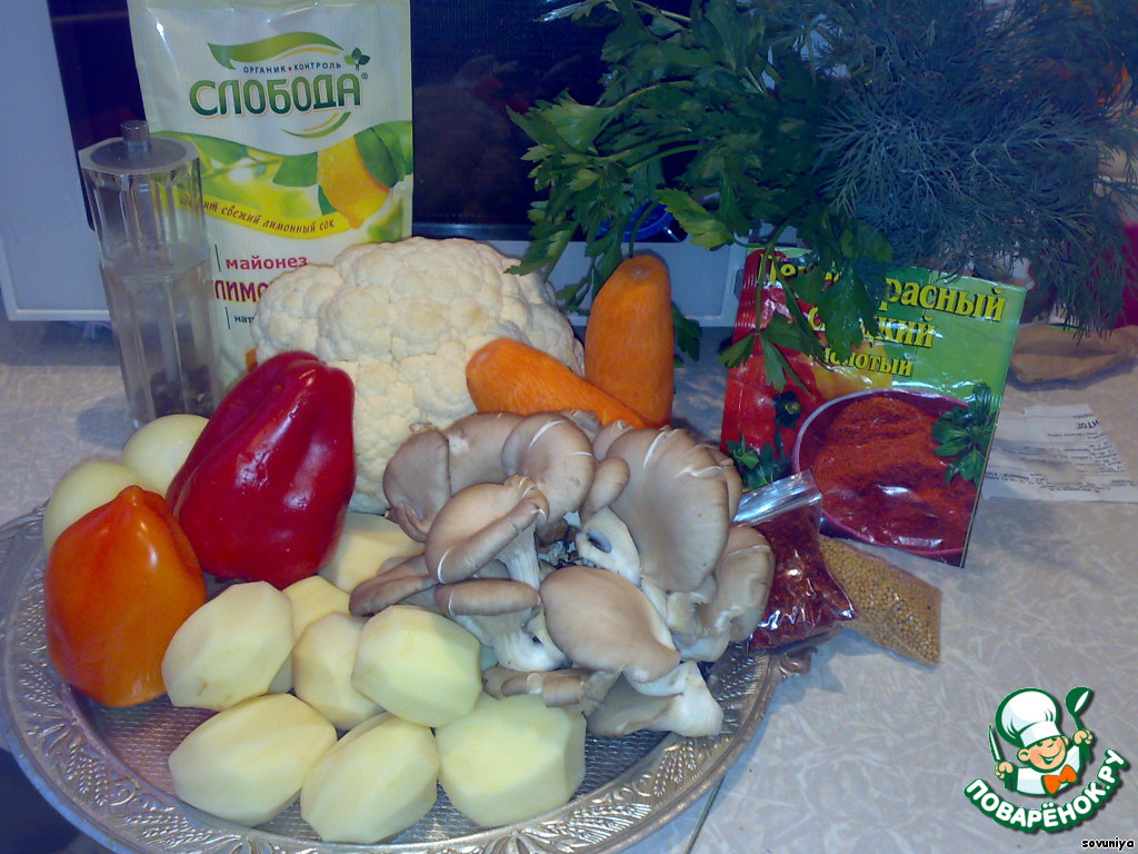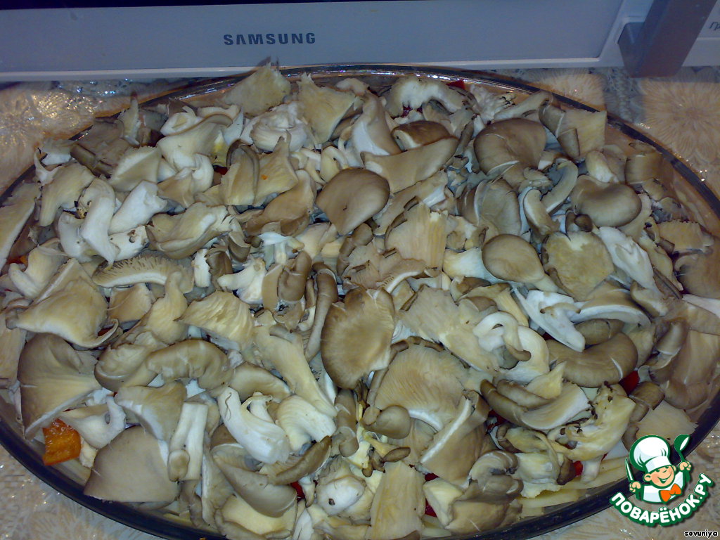 Овощи вымыть, очистить, нарезать: картофель и морковь - тонкими кружочками, перец - соломкой, грибы - не очень мелко пластинками /у меня вешенка, поэтому кусочками/.