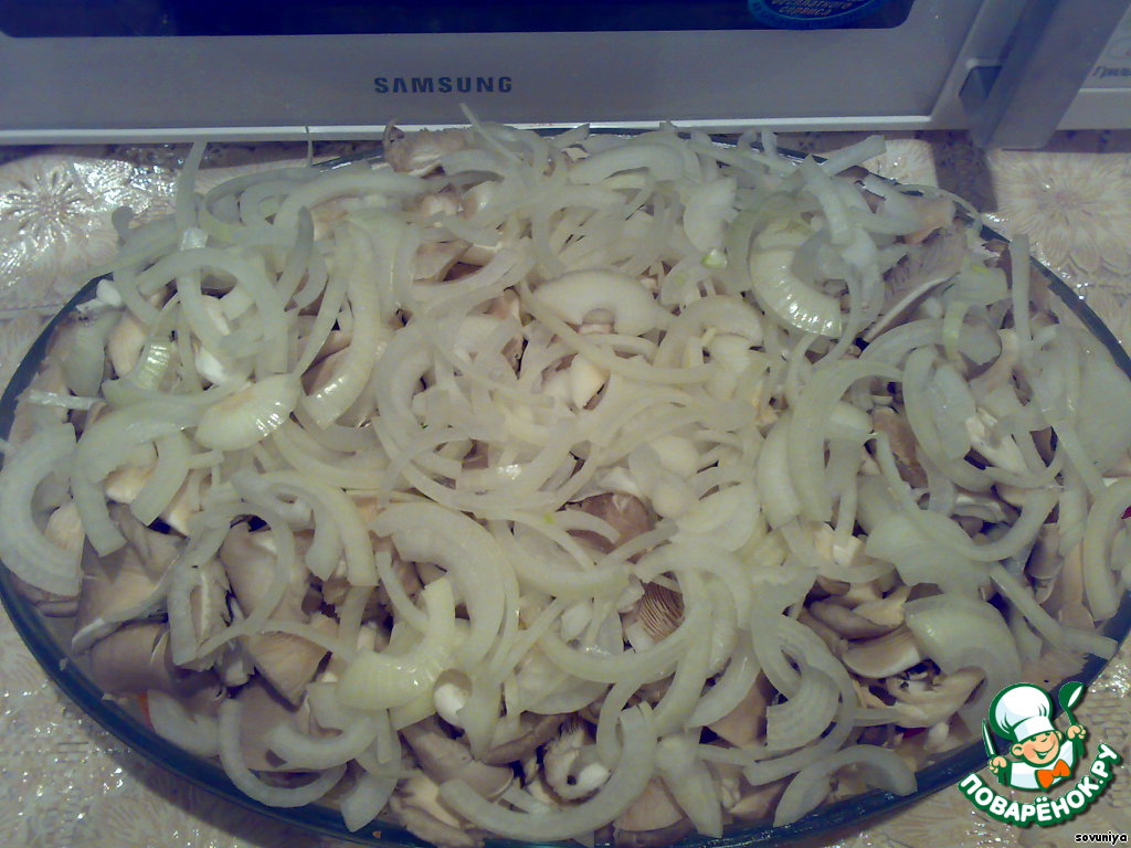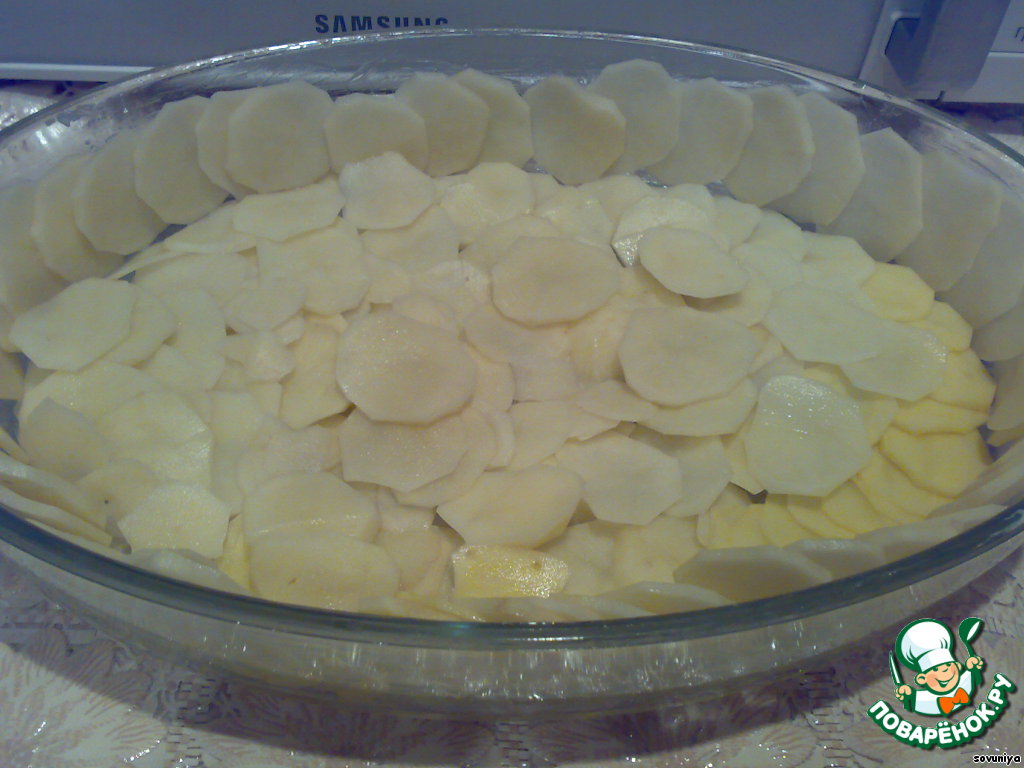 Форму для запекания смазываем сливочным маслом и начинаем укладывать слоями.