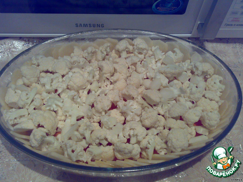 Цветную капусту разобрать на соцветия, лук нарезать полукольцами.