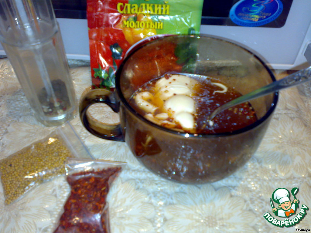 В мясной бульон добавляем майонез, специи: у меня это паприка сладкая молотая, томаты сушёные, смесь перцев горошком /белый, розовый, чёрный горький и душистый/, зёрнышки горчицы.