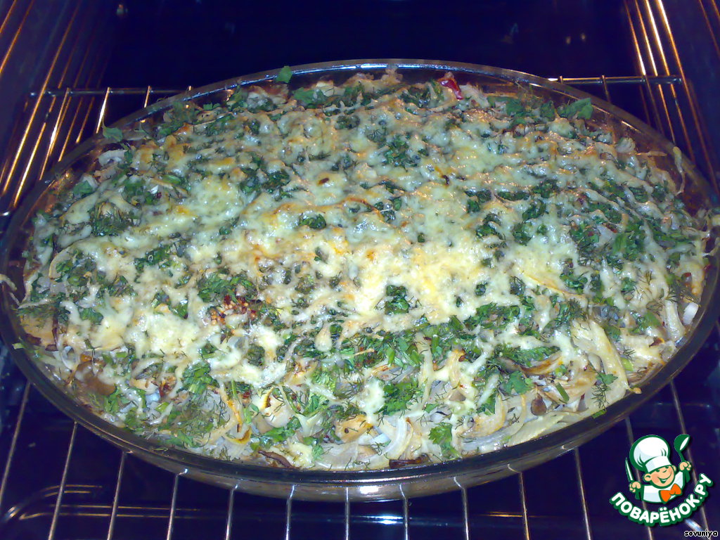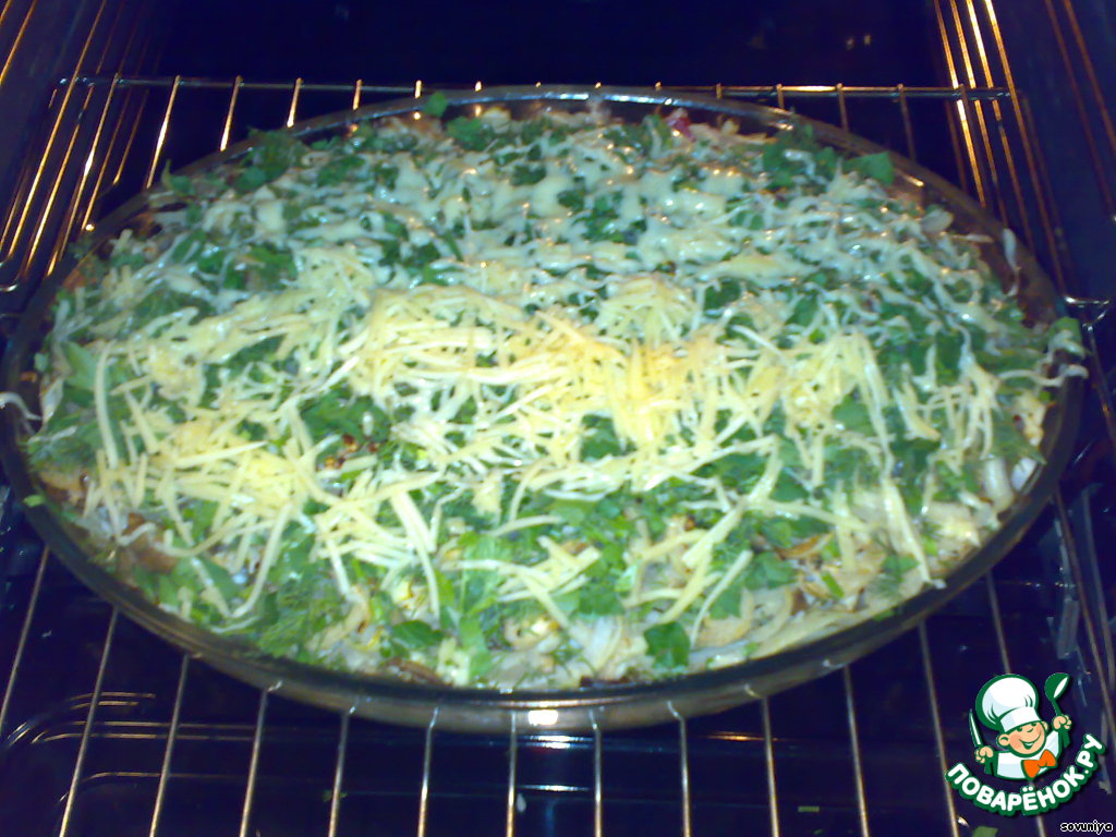 Через 40 минут посыпать зеленью и сыром - лучше всего для этой цели подойдёт пармезан, который хорошо плавится и даёт дополнительную сливочную нотку. У меня сыр Российский, да и того почти не оставили набежавшие голодные гости.