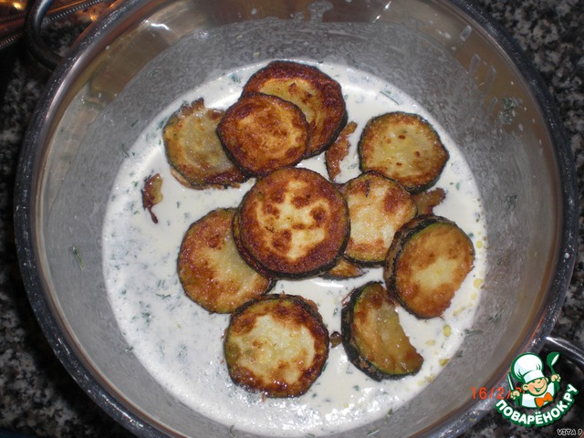 Жарить кабачки или цуккини на сковороде и горячими складывать в соус.