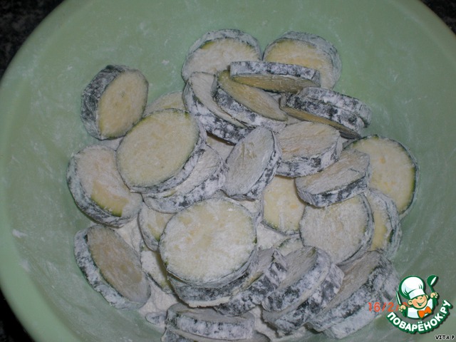 Цуккини порезать кружочками, посолить, обвалять в муке.
