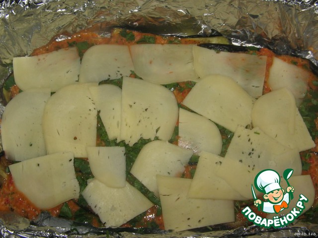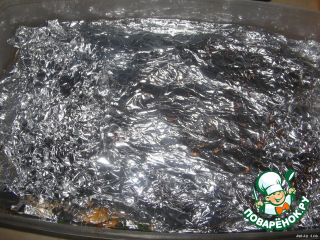 Форму выкладываем фольгой (в качестве формы у меня был пластиковый контейнер, так как термической обработки больше не будет), так чтобы по краям фольга свисала, чтобы её было достаточно для того, чтобы накрыть сверху готовый террин. Смазываем растительным маслом.