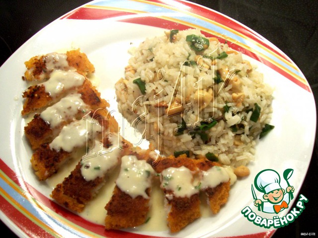 К рису у нас было рыбное филе в яйце и панировочных сухарях и сливочным соусом.