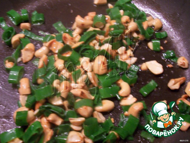 На сухой сковородке обжарить порезанные кусочками кешью.