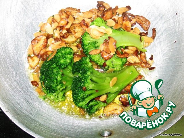 кладем броколли, орегано , соль, перец жарим 2-3 минутки