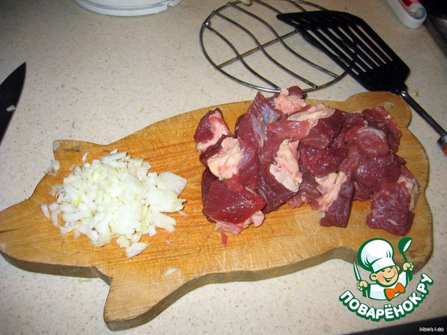 2.Баранину помыть и порезать небольшими кусочками. Лук почистить и мелко нарезать.