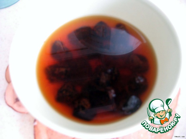 1.Чернослив помыть и залить горячим чаем на 3 часа.