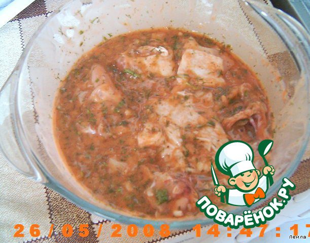 Лук натереть на терке, порезать чеснок, петрушку, добавить остальные ингредиенты, смешать воду с лимон. соком, уксусом, сах.песком, все это хорошенько вместе перемешать.