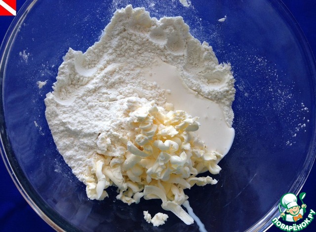 Сначала приготовим песочное тесто. У меня такой рецепт: замороженное сливочное масло (или маргарин) натираем на крупной терке, добавляем сметану, соду, просеянную муку и замешиваем тесто. Заворачиваем в пищевую пленку и убираем на полчаса в холодильник.