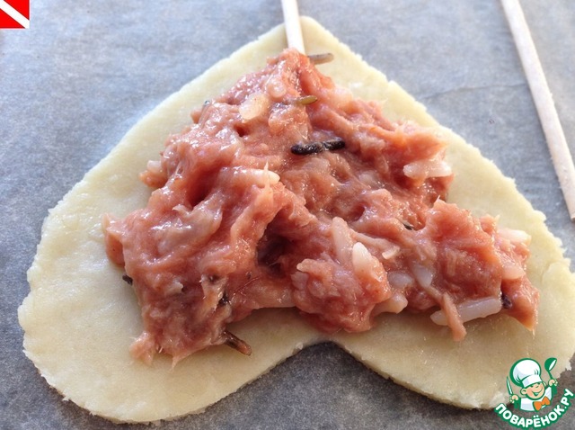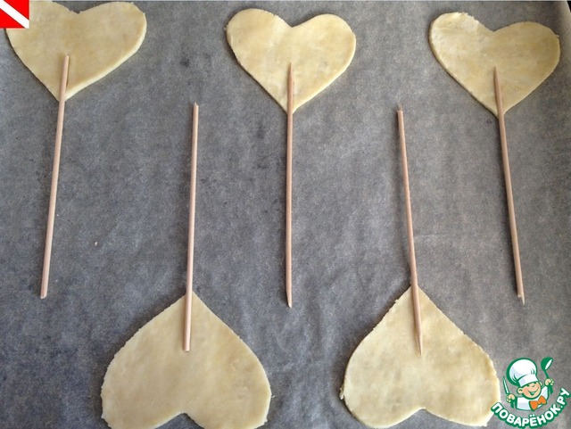 Охлажденное тесто раскатываем тонким слоем (1-2 мм), при необходимости стол можно подпылить мукой. Вырубкой в виде сердечка или просто при помощи трафарета вырезаем сердечки.