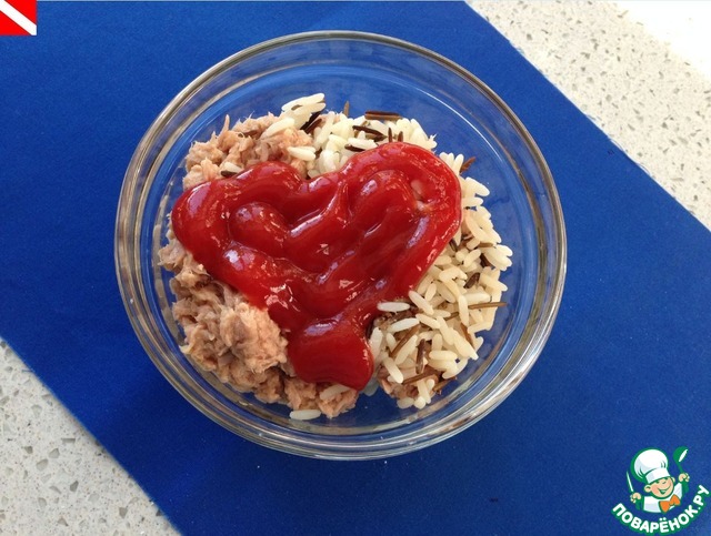 Готовим начинки. Начинка №1 - сливаем жидкость из баночки с консервированным тунцом, добавляем приготовленный рис и томатный соус (можно кетчуп) по вкусу.
