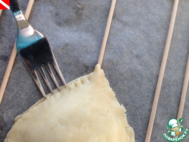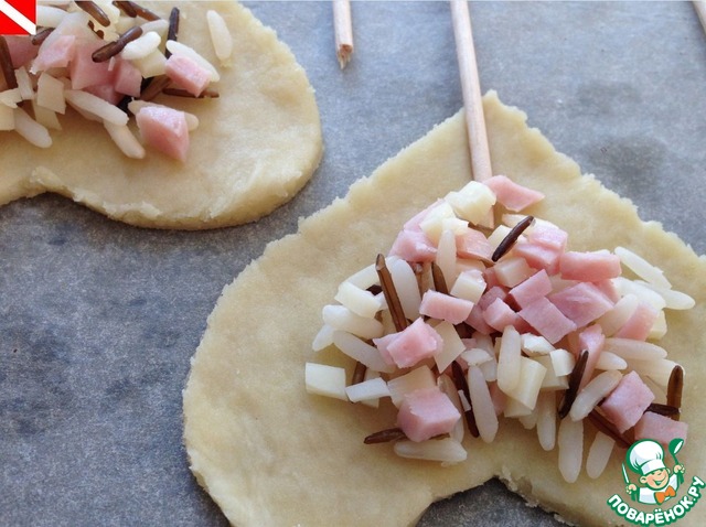 Выкладываем половину заготовок на пергаментную бумагу. Кладем (слегка вдавливая) деревянные шпажки.