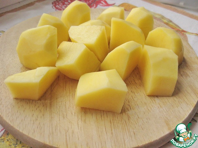 Картофель почистить и разрезать на 4 части. Варить в подсоленной воде в течение 15-20 минут до готовности.
