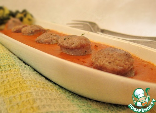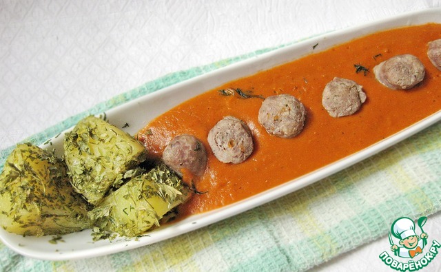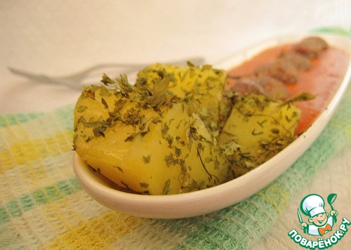 Готовый картофель обмакнуть в растопленное сливочное масло (можно использовать растительное масло) и обвалять в зелени. На тарелку выложить колбаски с соусом и картофель.