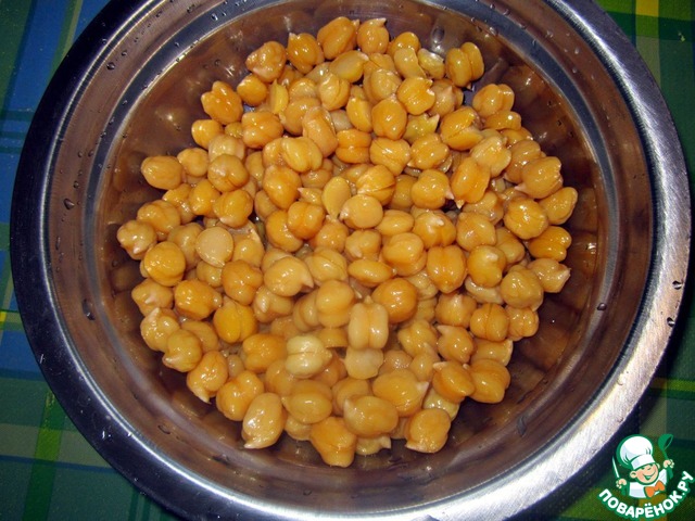 Нут замочить в холодной воде на 4 часа, после чего воду сменить и варить до готовности (40-60 мин). Подсолить воду в конце варки (!) иначе нут (как и все бобовые) будет варится дольше. Очистить от пленки.