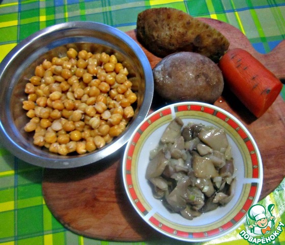 Грибы, я взяла вешенки, помыть, порезать и обжарить на растительном масле с луком.