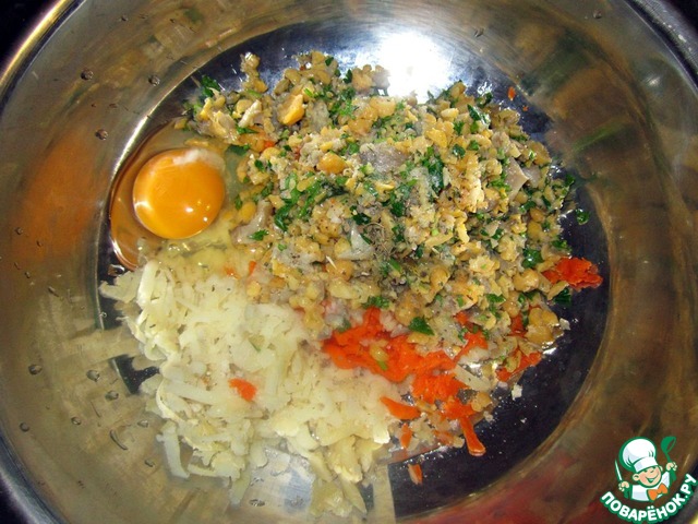 Так как я готовлю запеканку и паштет одновременно, то берем сначала одну половину продуктов, овощи (предварительно очищенные) натираем на крупной терке, добавляем специи, зелень, жаренные грибы, нут и яйцо. Тщательно перемешиваем.