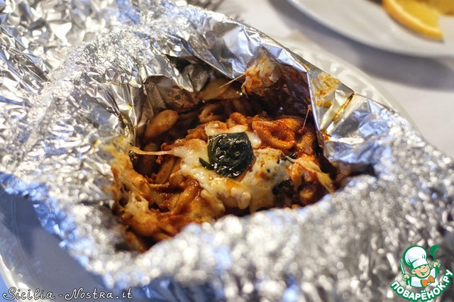 | Запеченная паста "кавателли" с баклажанами, базиликом и моцареллой - это традиционный рецепт региона Агридженто (южное побережье Сицилии). Вкус очень нежный, приятный, необычный для макарон, т. к. благодаря запеканию в фольге, паста максимально пропитывается ароматом базилика, овощей и моцареллы. |