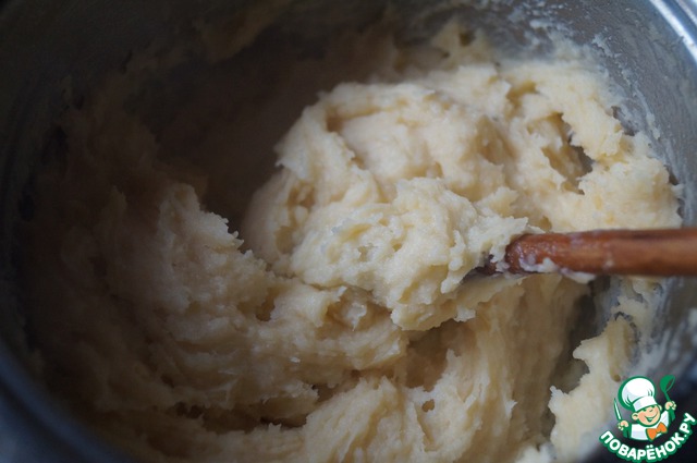 Постепенно добавлять взбитые яйца, тщательно вымешивая тесто.