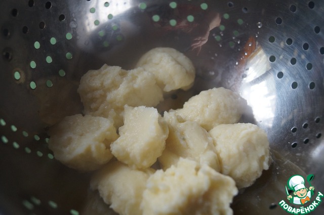 Варим клёцки на слабом огне до их всплытия и выкладываем в дуршлаг, чтобы дать стечь воде.
