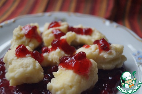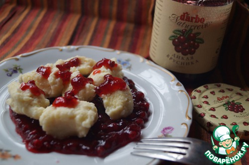 Положить на соус клёцки и сбрызнуть им же сверху. Можно приглашать домочадцев к столу!