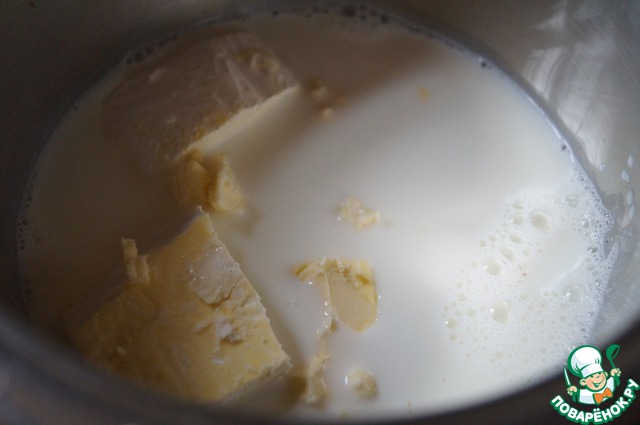 Молоко и масло (маргарин) положить в небольшую кастрюльку и довести до кипения. Добавить ванильный сахар и немного присолить.