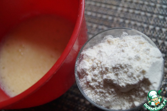 Пока молоко греется, взбить в отдельной посуде яйца и отмерить муку.