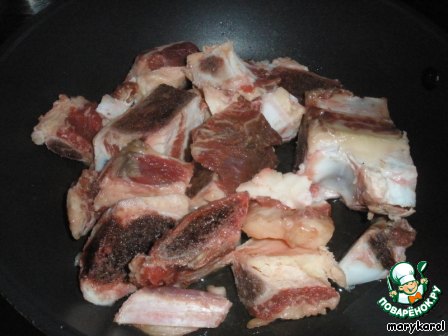 Ставим на огонь кастрюлю (3-4 л) и наливаем 1,5 л воды. Тем временем на разогретую сковороду наливаем масло и обжариваем наши кусочки мяса с косточками.