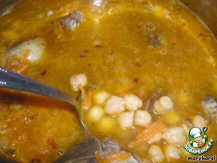 Добавляем горох нут, убавляем огонь меньше среднего, прикрываем крышкой и тушим час-полтора, пока нут не станет мягкий внутри. Если нут достаточно вымочен, то готовится быстрее, в этот раз у меня за 50 минут был готов. Надо пробовать, т.к. он не разваривается и ножом прокалывать неудобно.