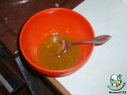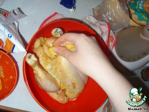 От души натираем полученной смесью нашу птичку и и оставляем ее минут на 15-20, чтобы немного пропиталась. В емкости с карри и маслом должна остаться где-то одна столовая ложка смеси.