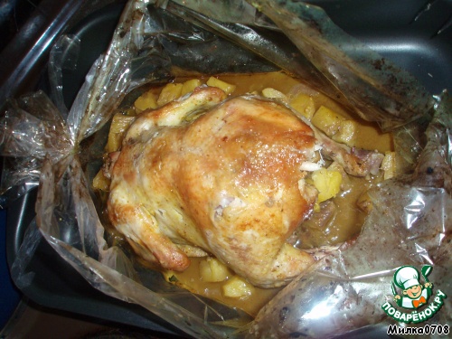Упаковываем в рукав для запекания, обкладываем остатками ананаса, выливаем оставшийся соус (если таковой имеется). Ставим в разогретую духовку минут на 40-50. Я готовила при 250 градусах, но у нас старая плита и духовка греет плохо, поэтому выбирайте обычную температуру, при которой Вы готовите птицу.