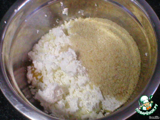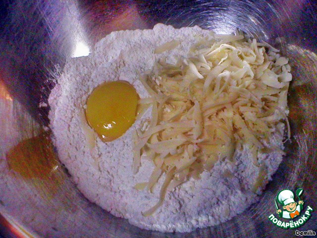 Смешиваем муку с разрыхлителем, добавляем 75г размягченного масла, тертый сыр, 1 желток и немного соли. Перетираем все в крошку. Выкладываем в смазанню маслом форму (24 см.) и убираем в холодильник на 30 мин.